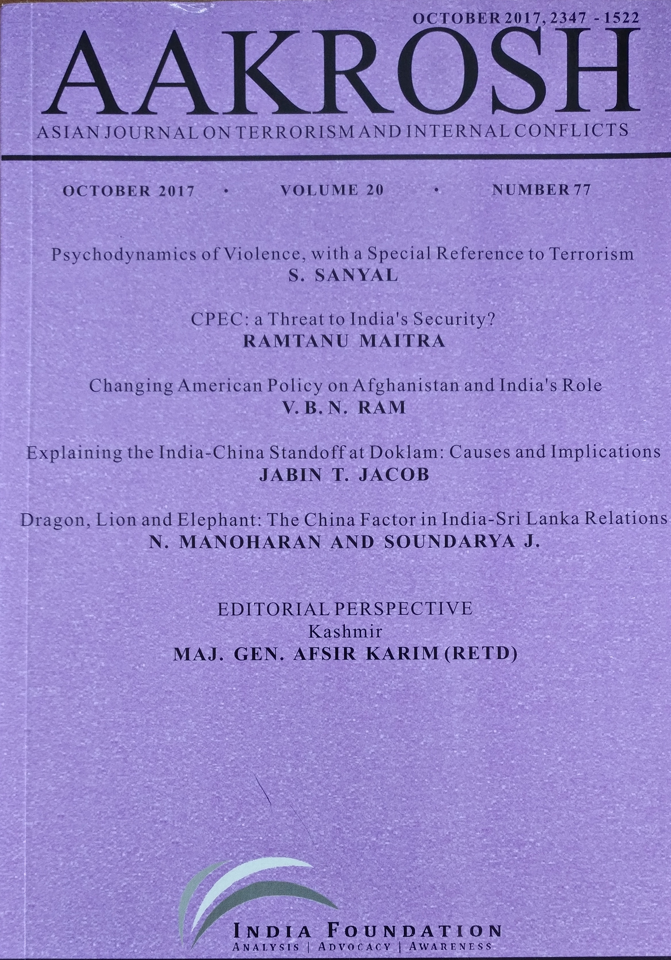‘Explaining the India-China Standoff at Doklam: Causes and Implications’, Aakrosh, Vol. 20, No. 77, October 2017, pp. 60-76.